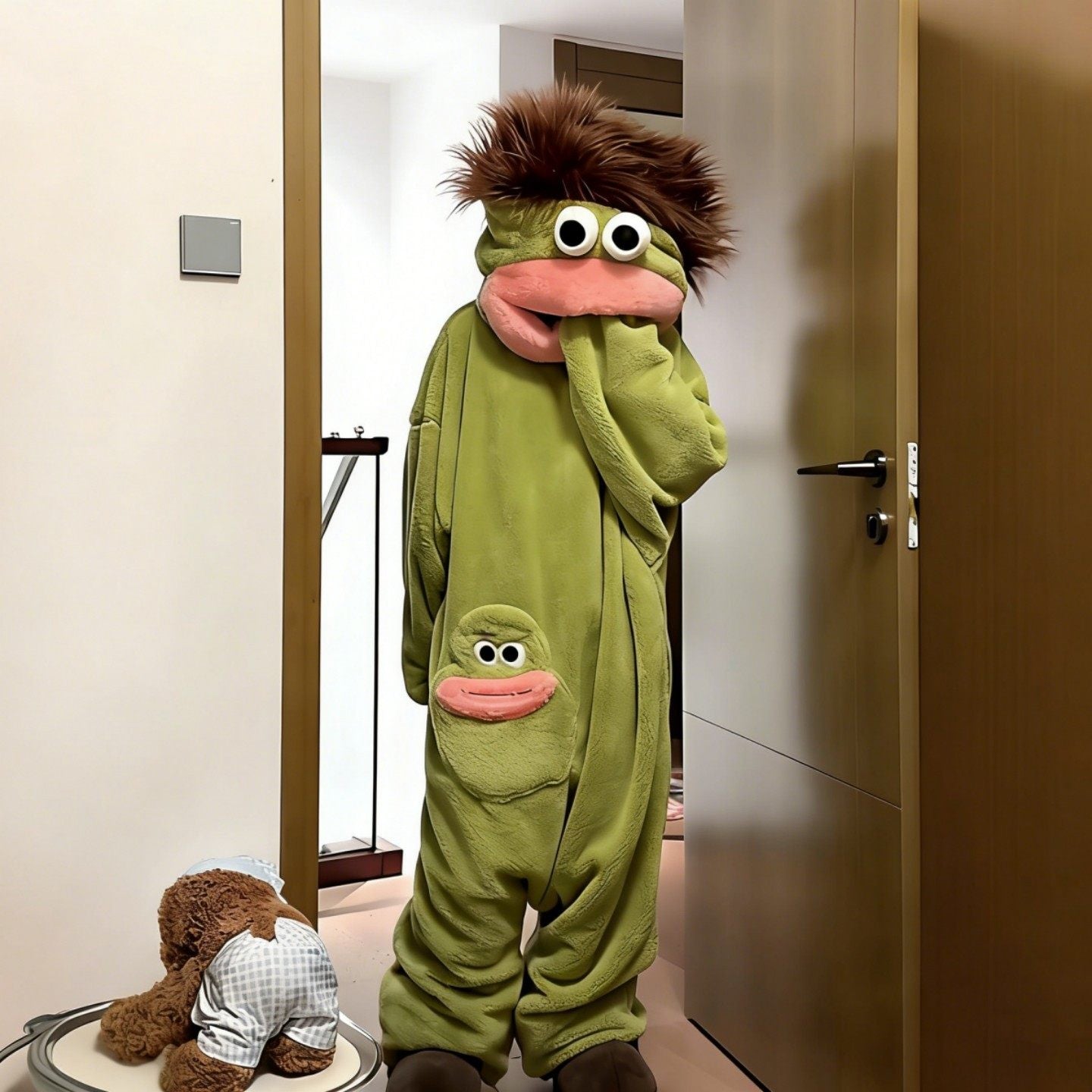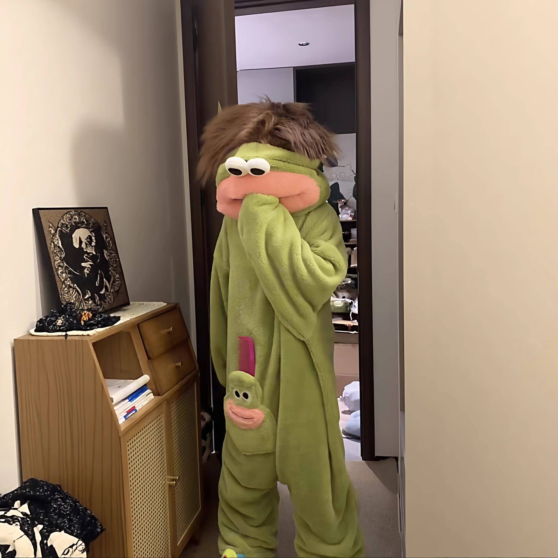 A hooded, zip-up one-piece pajama in soft coral fleece, made as a playful loungewear gift. The selected style is listed as including a large comb accessory, which matches the “hair” detail.
